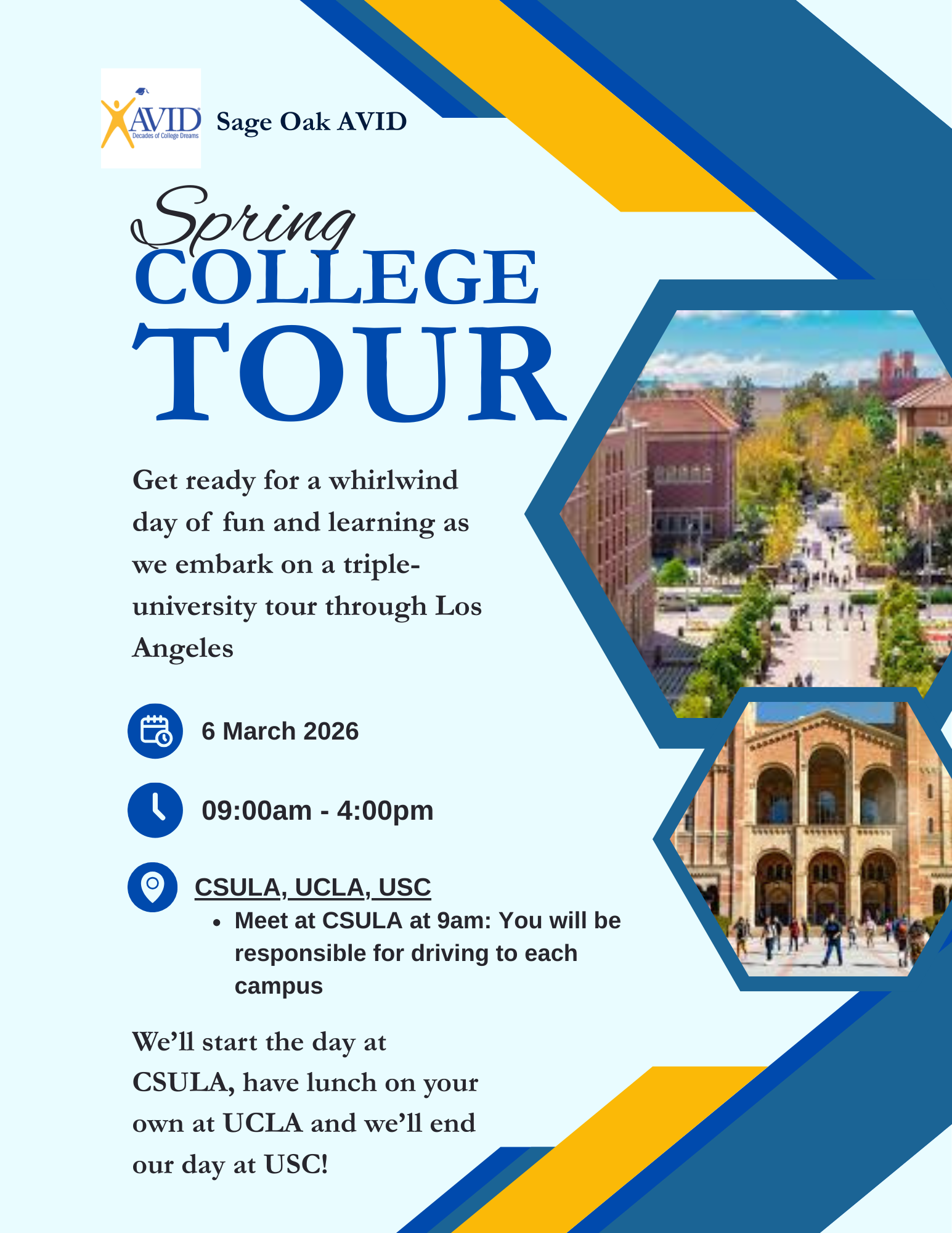 Get ready for a whirlwind day of fun and exploration as we embark on a three-part college tour through Los Angeles universities! Parents and students will meet at Cal State Los Angeles at 9am for a campus tour before moving onto UCLA and finally USC. (You will provide your own transportation between campuses.) Guests are welcome to join for one, some or all of the tours! The tours are free although parking fees may be required. Younger siblings are welcome.